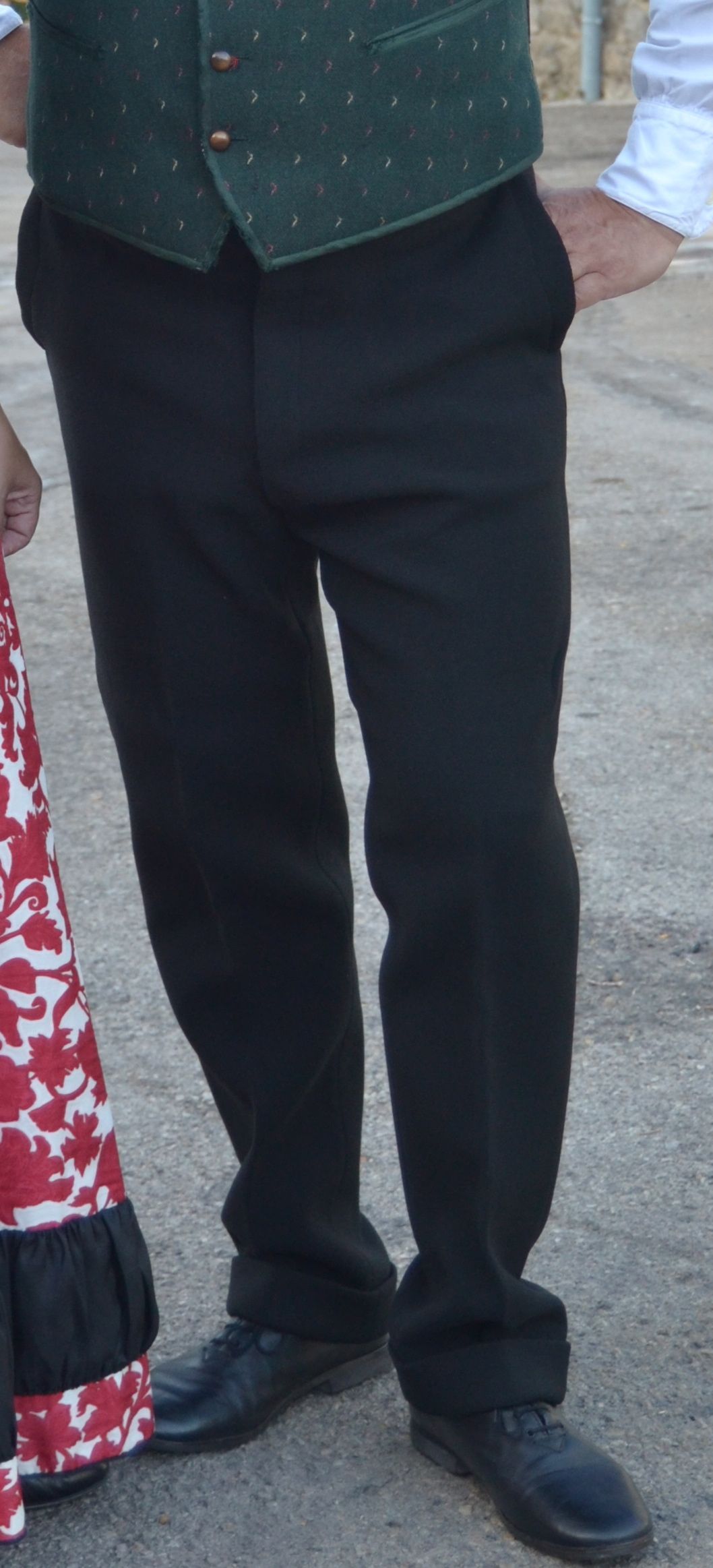 Shorts: Made with wool, indiana, cotton and thread mix,... They are straight cut and fasten at the waist with buttons and tucks. Bibs: Covers the man's body, over the shirt. Made with two types of clothes: one for the front, usually silk, indiana, wool,... with prints, black or colored clothes, and another for the back in thinner clothes made of cotton, lining, list , of a single color. Two collars and buttons in a row. Shirt: Piece that covers the man's body. Made in cotton clothes, a mixture of cotton and linen, thread, white, with the hem decorated with tavels, bastes, frills,... . Concealments: Wide strips of Y-shaped elastic, with eyelets at the ends, which are attached to the buttons of the shorts. Hat: To protect from the sun. Made of palm.Shoes: Closed shoes of dyed leather and leather sole, flat, fastened with laces or buckles.Clothes: Wool or cotton, white or dyed in dark tones.