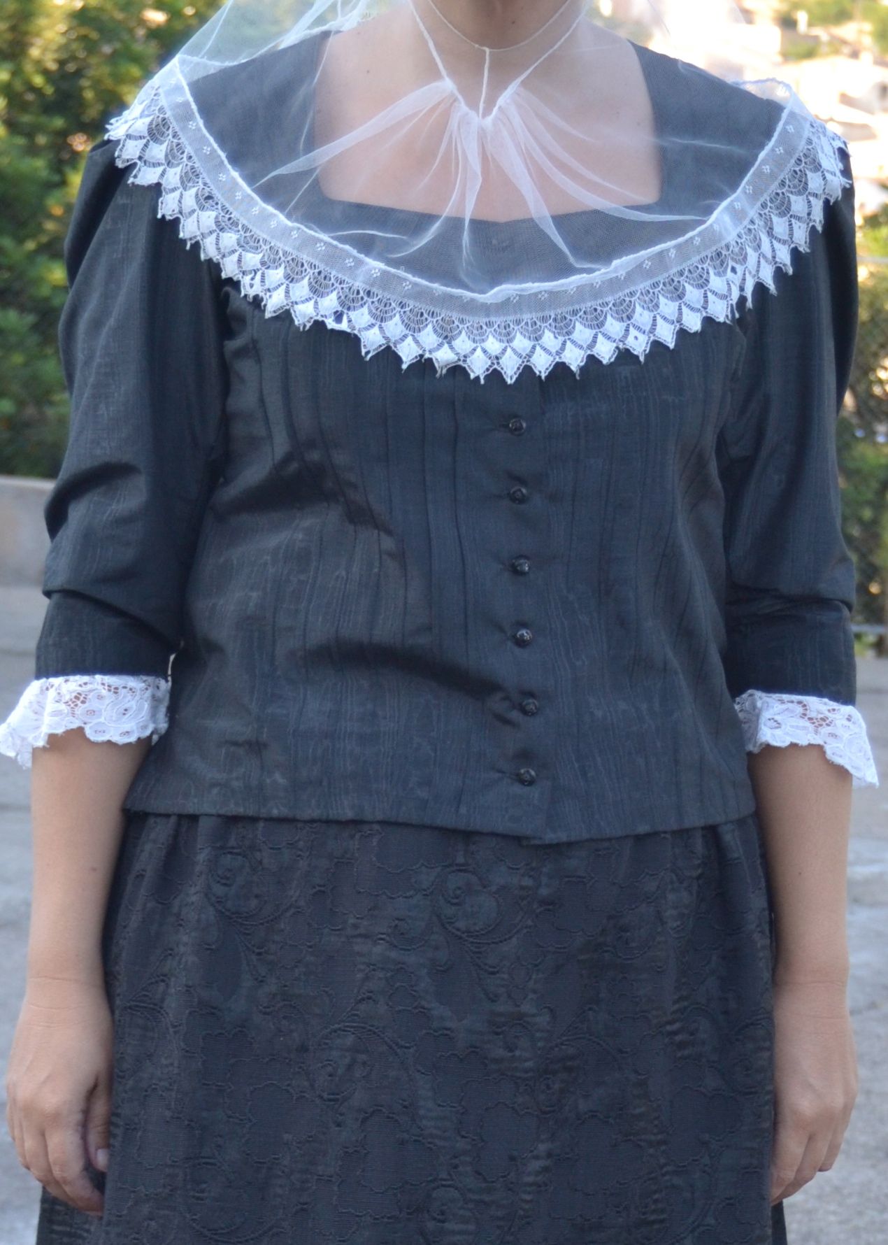 Petticoats or underskirts: Made of white cotton or thread. Generally, they take two or three to give volume to the upper skirt. They are pleated at the front of the waist and gathered at the back, fastened with a seam. At the bottom, adorned with all kinds of embroidery, lace, openwork or lace, according to the person's taste or status. Skirt: Clothes that cover from the waist to the ankles. Made in silk, damask, brocade,... depending on the person's purchasing power or status. Made with smooth or pleated pieces at the front and with frills and wrinkles at the back. Apron: If they wore one, it was a piece of fine cotton, silk, linen, tulle, ... very elaborate in embroidery or randes.Gipó: Clothing that covers the woman's body. Colored or black, made of silk fabric or a mixture of silk and cotton. Fitted to the body with sleeves up to the elbow where they end with a lace or band. The buttoning: set of five buttons plus two at the end, in pairs, which make the collar, are worked in gold and rhinestones. Frill/frill: Piece that covers the head. They are made of fine thread fabric, muslin, tulle, mesh, ... with embroidery or stripes. Footwear: Shoes covered in dyed leather and leather sole, generally with a bit of trim, fastened with laces or buckles. Pantyhose: Woven with white or dyed cotton thread, made with plain pantyhose or with openwork.