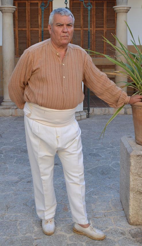 Shorts: Because of the particular shape of this garment, they are called shorts with puffs or wide. They go below the knee where they are fastened with stripes. Made in cotton fabrics, cloth, list,...Gardapits: Covers the man's body, over the shirt. Made with two types of clothes: one for the front part, usually of list, cotton or cloth, brushed or colored, and another for the back, in thinner clothes, cotton or list of one color. They don't have a neck. The composition of the buttons, in pairs, is called collada. They are made of bone, thread, or mother-of-pearl. Shirt: Piece that covers the man's body. Made in cotton clothes, list or a mixture of cotton and linen, in plain or twilled dark tones. Scarf: Square in cotton fabric or list that is put on the head or tied around the neck. Band: Also called a trocha, it is a piece of a palm or a palm and a half in width by about fourteen in length. It is tied at the waist, doing the functions of holding the shorts and protecting the belly and back. Hat: To protect from the sun. Made of palm Footwear: Espadrilles with esparto sole and canvas Tights: Wool dyed in dark tones.